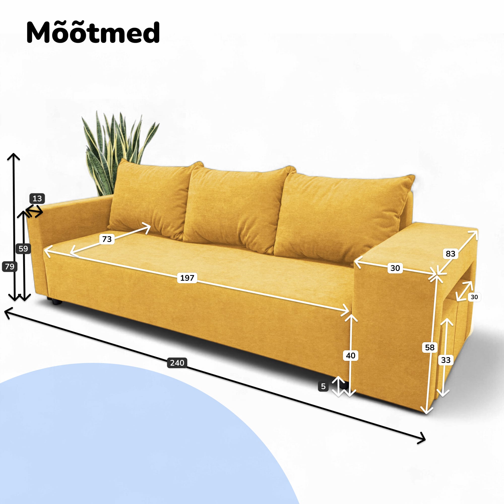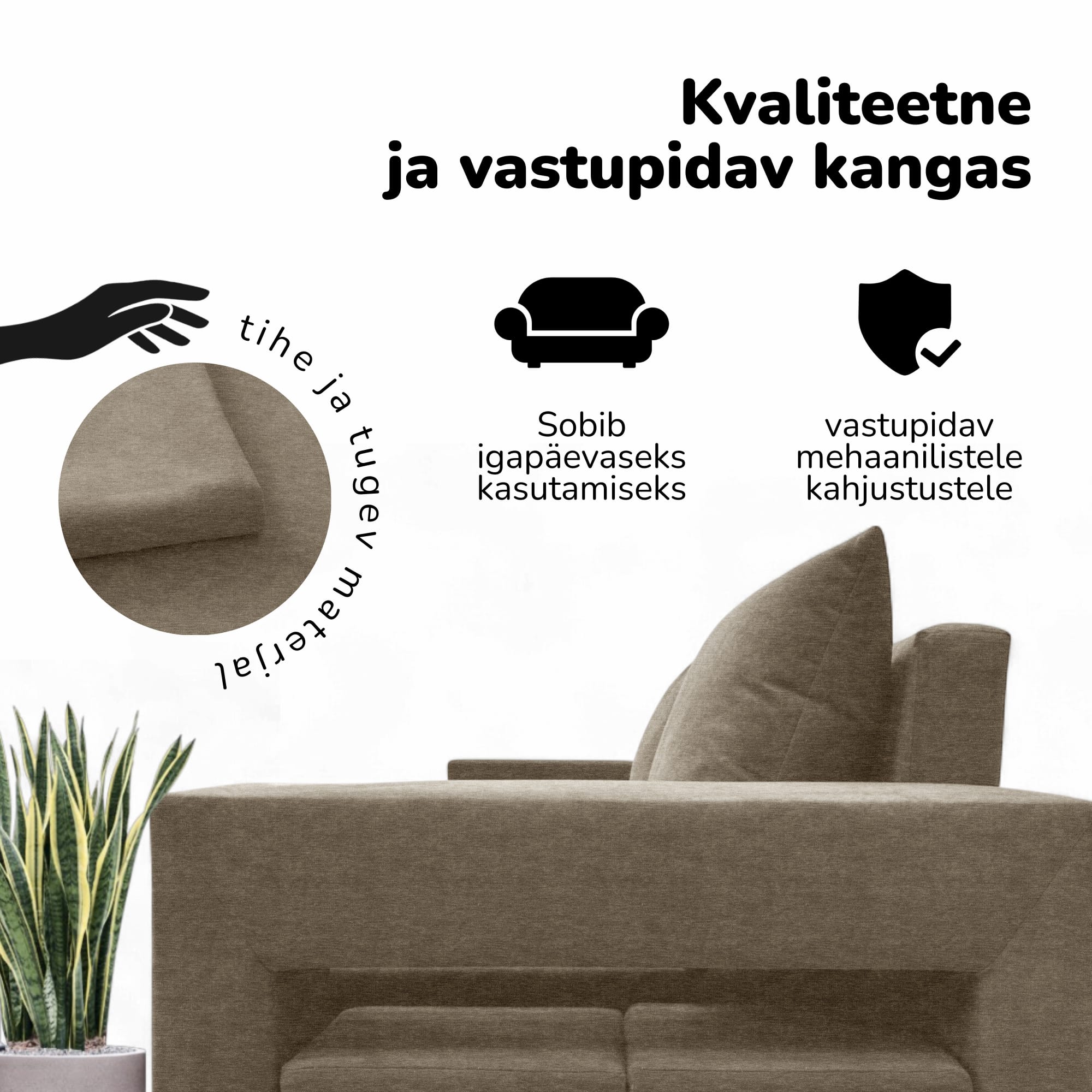 See diivan kaheinimesevoodi, laua ja kahe jalapingiga on funktsionaalne komplekt mugavaks elamiseks. See sobib ideaalselt igapäevaseks kasutamiseks elutoas, magamistoas, lastetoas, köögis või kontoris. Selle kompaktne disain voldib kergesti täismõõdus voodiks ja alumises osas on mahukas sahtel. Komplektis olev laud ja kaks jalapingit on lisaboonuseks – praktilised ja mugavad igapäevaseks lõõgastumiseks või külaliste vastuvõtmiseks. Diivaniraam on valmistatud vastupidavast puitplaadist ja vineerist, kõik ühendused on kinnitatud kruvidega, tagades töökindluse ja pika kasutusea. Täiteainena on kasutatud ülitugevat mööblikvaliteediga polüuretaanvahtu – see hoiab oma kuju ja annab keskmise kõvaduse tunde mugavaks magamiseks ja lõõgastumiseks. Polster on paksust veluurkangast: pehme puudutusega, hingav, pleki- ja kulumiskindel (35 000 tsüklit Martindale’i testi järgi) ning kergesti puhastatav. Saadaval on populaarsed värvid: beež, pruun, kollane, türkiissinine, helehall ja grafiit. Oma ergonoomilise disaini, hõlpsasti ümberkujundatava konfiguratsiooni, keskkonnasõbralikkuse ja kergesti puhastatava disainiga pakub see diivan koos turniiride ja lauaga ideaalset tasakaalu funktsionaalsuse, stiili ja taskukohasuse vahel. Välimuse säilitamiseks soovitame pinda puhastada seebilahusega ringjate liigutustega.