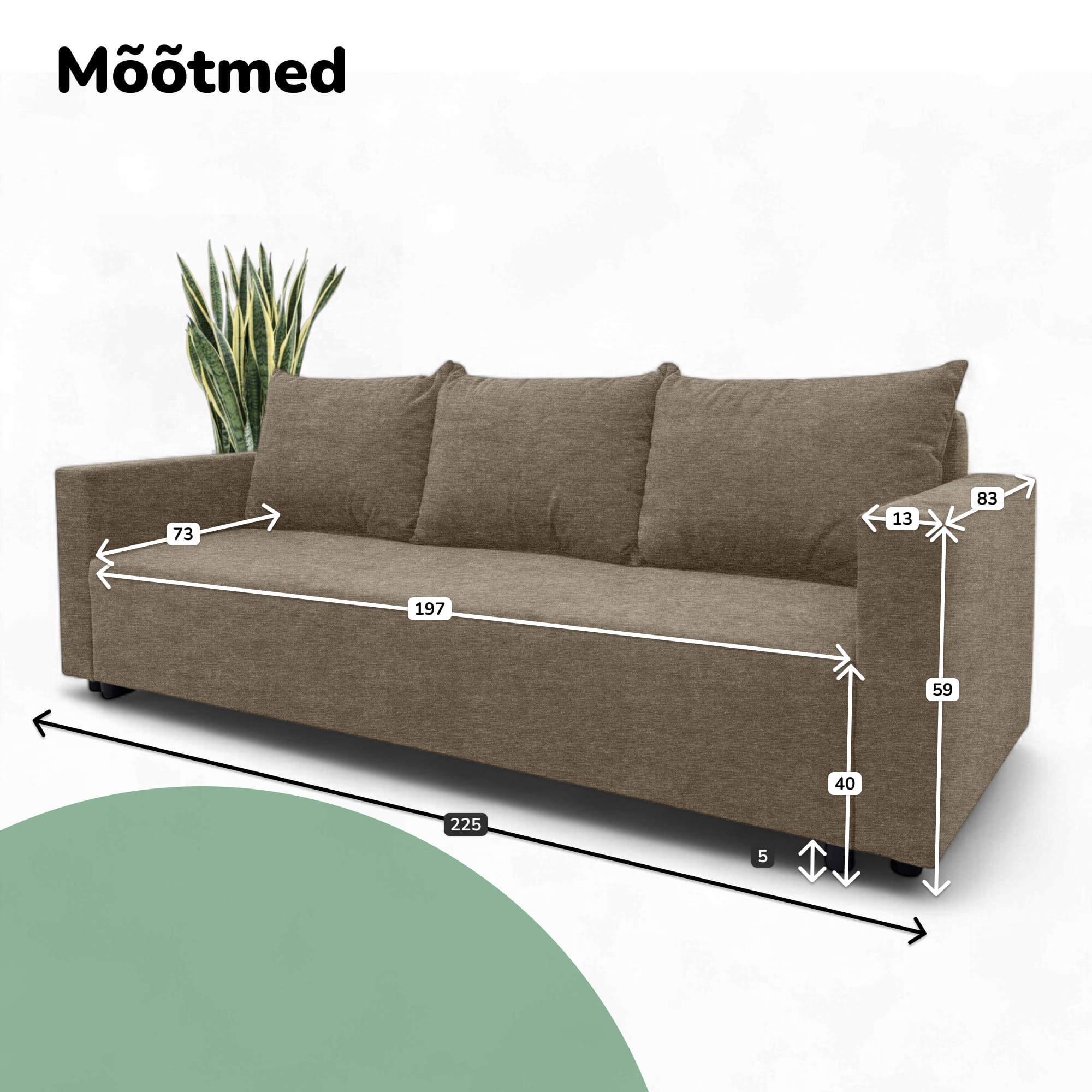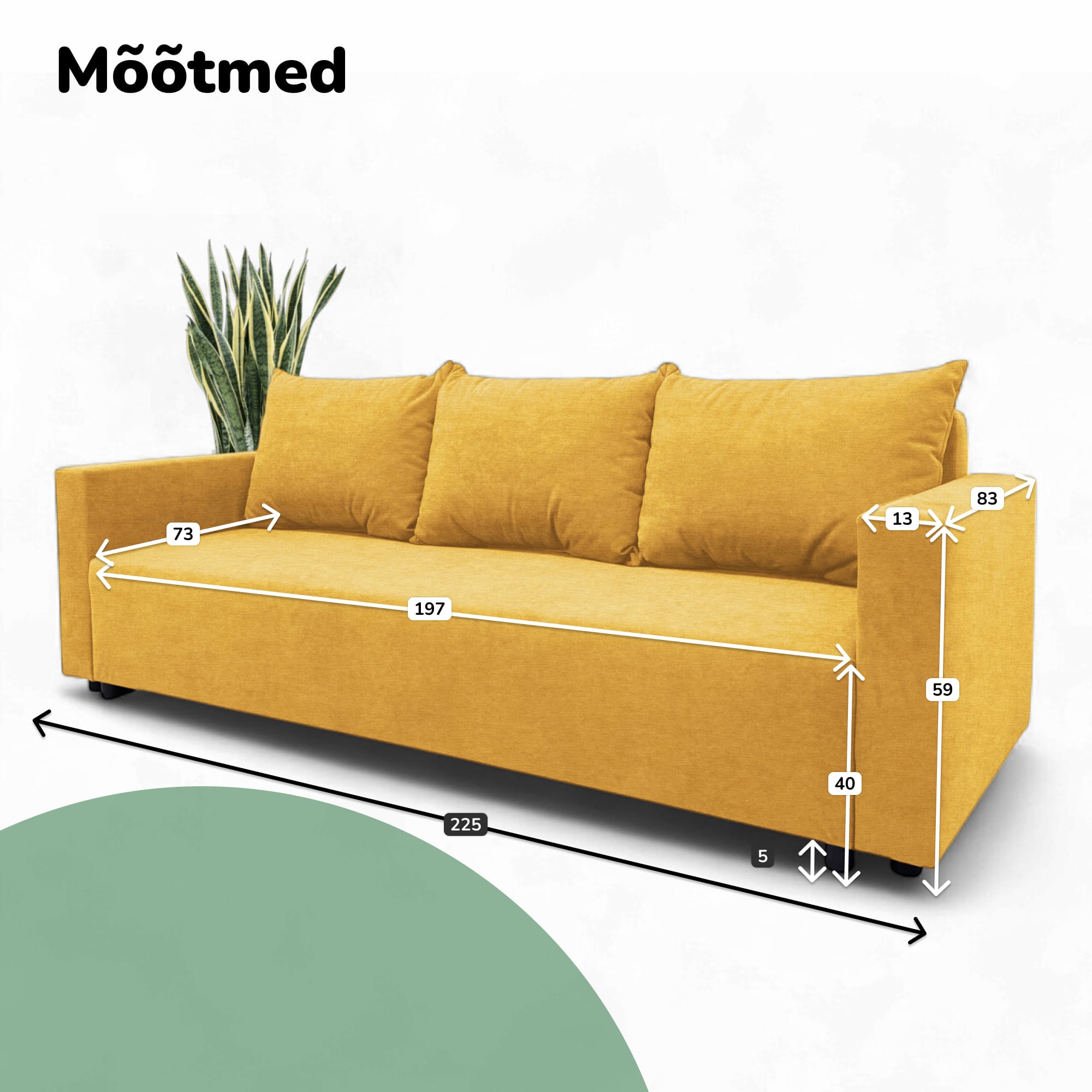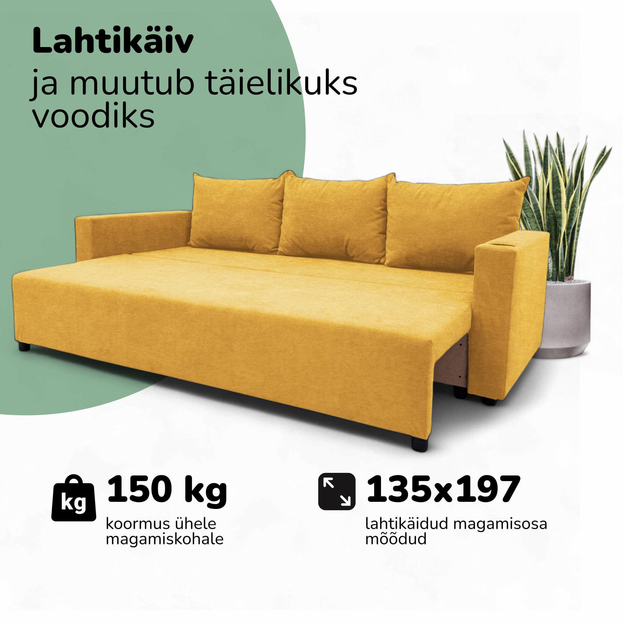 See kaheinimese diivanvoodi on mitmekülgne ja kompaktne lahendus igapäevaseks kasutamiseks. See muudetakse kergesti täismõõdus voodiks ning sellel on mahukas sahtel voodipesu jaoks, mis teeb selle eriti mugavaks väikestesse ruumidesse, nagu stuudiokorterid, lastetoad, köögid või kontorid. Raam on valmistatud vastupidavast puitplaadist ja vineerist. Kõik vuugid on tugevdatud kruvidega klambrite asemel, mis suurendab oluliselt diivani tugevust ja vastupidavust. Täidiseks on suure tihedusega mööblikvaliteediga polüuretaanvaht, mis taastab kiiresti oma kuju ja pakub keskmise kõvadusega mugavust. Polster on tihe veluur: meeldiv puudutusele, hingav, keskkonnasõbralik, kergesti puhastatav ja kulumiskindel (35 000 tsüklit Martindale’i testi järgi). Mudel on saadaval kuues universaalses värvitoonis: beež, pruun, kollane, türkiissinine roheline, helehall ja grafiit – kõik sobivad igasse interjööri. Selle stiilne välimus, vastupidav konstruktsioon, lihtne hooldus ja läbimõeldud funktsionaalsus muudavad selle diivani suurepäraseks valikuks suurepärase hinna ja kvaliteedi suhtega. Hooldus on lihtne: puhastage pinda seebilahusega ringjate liigutustega.