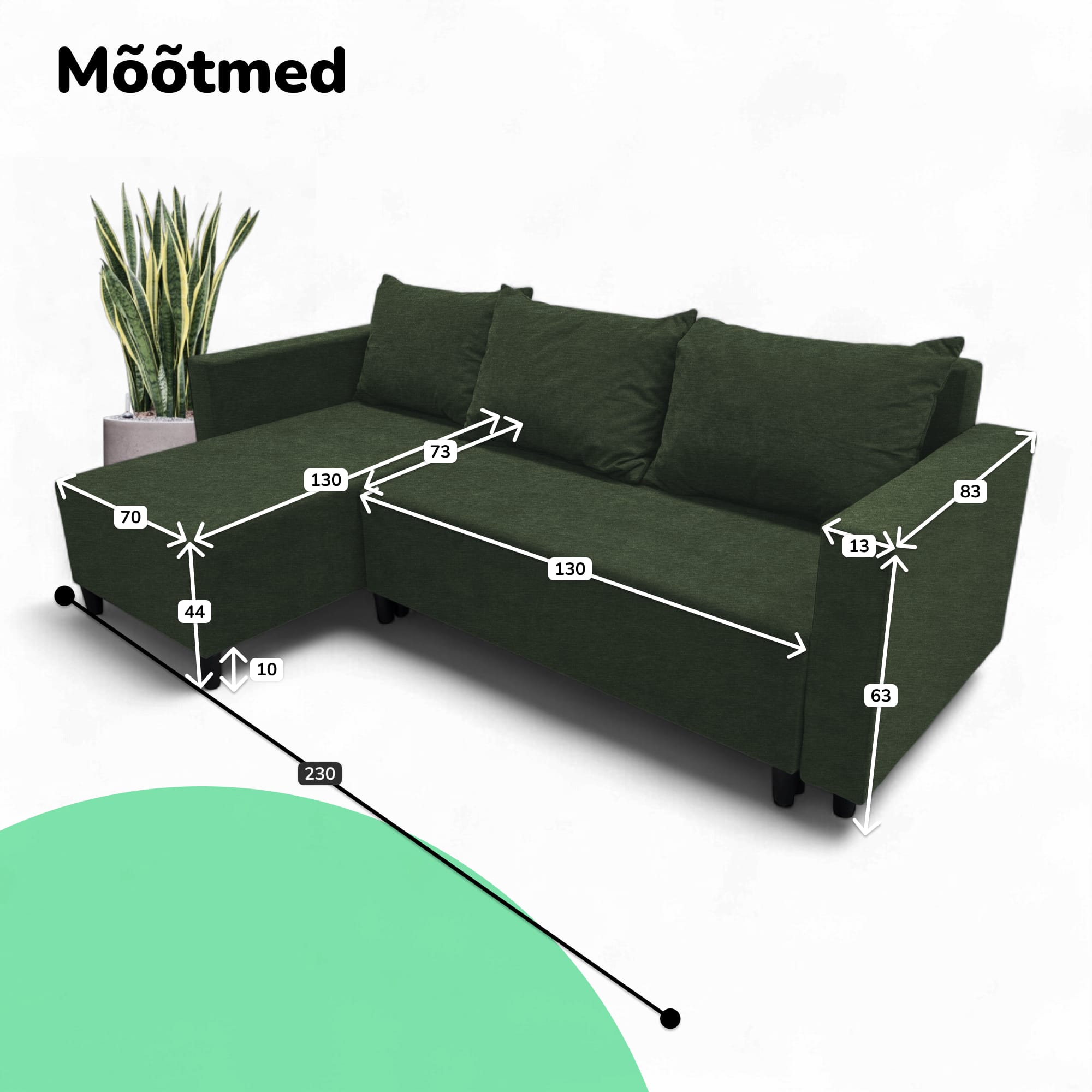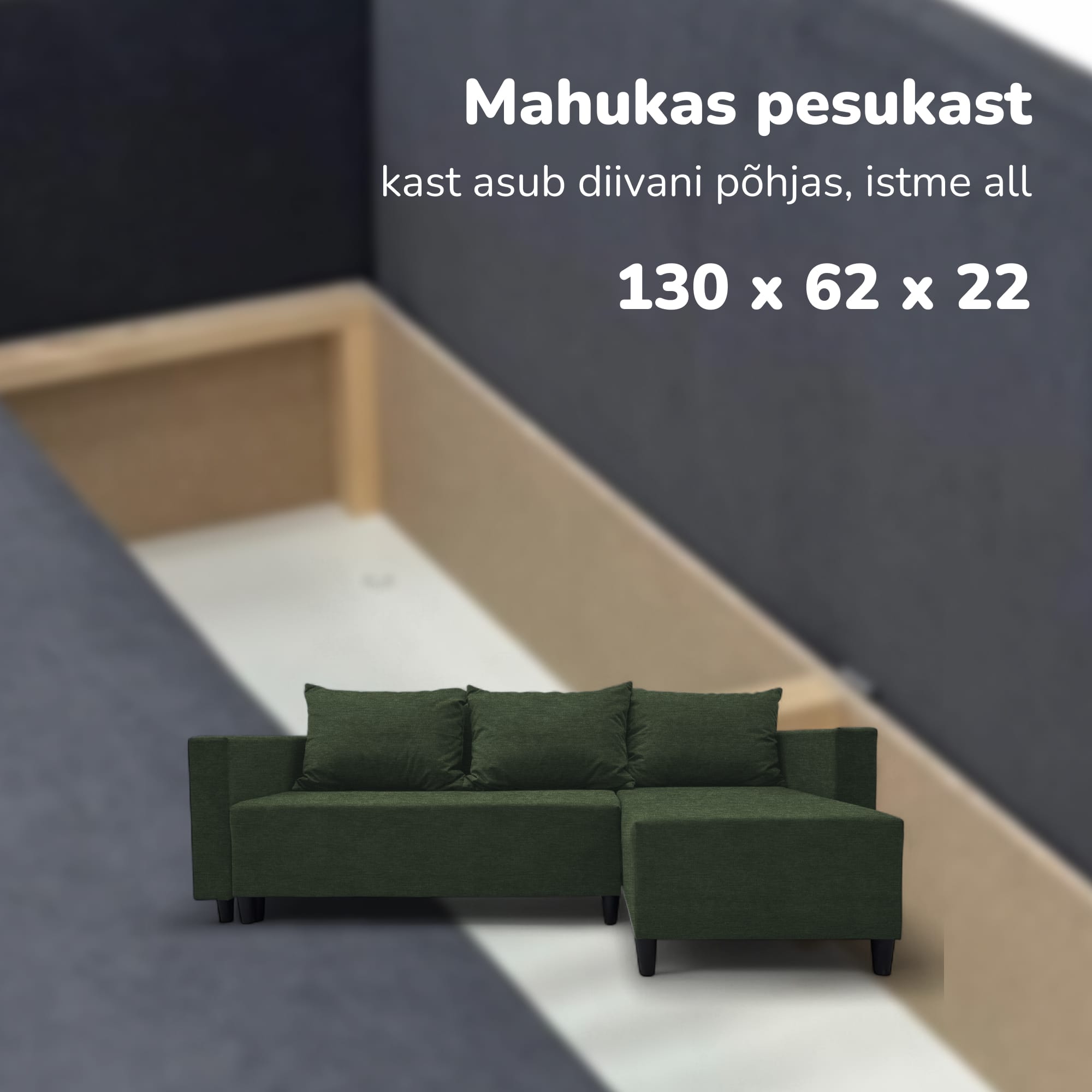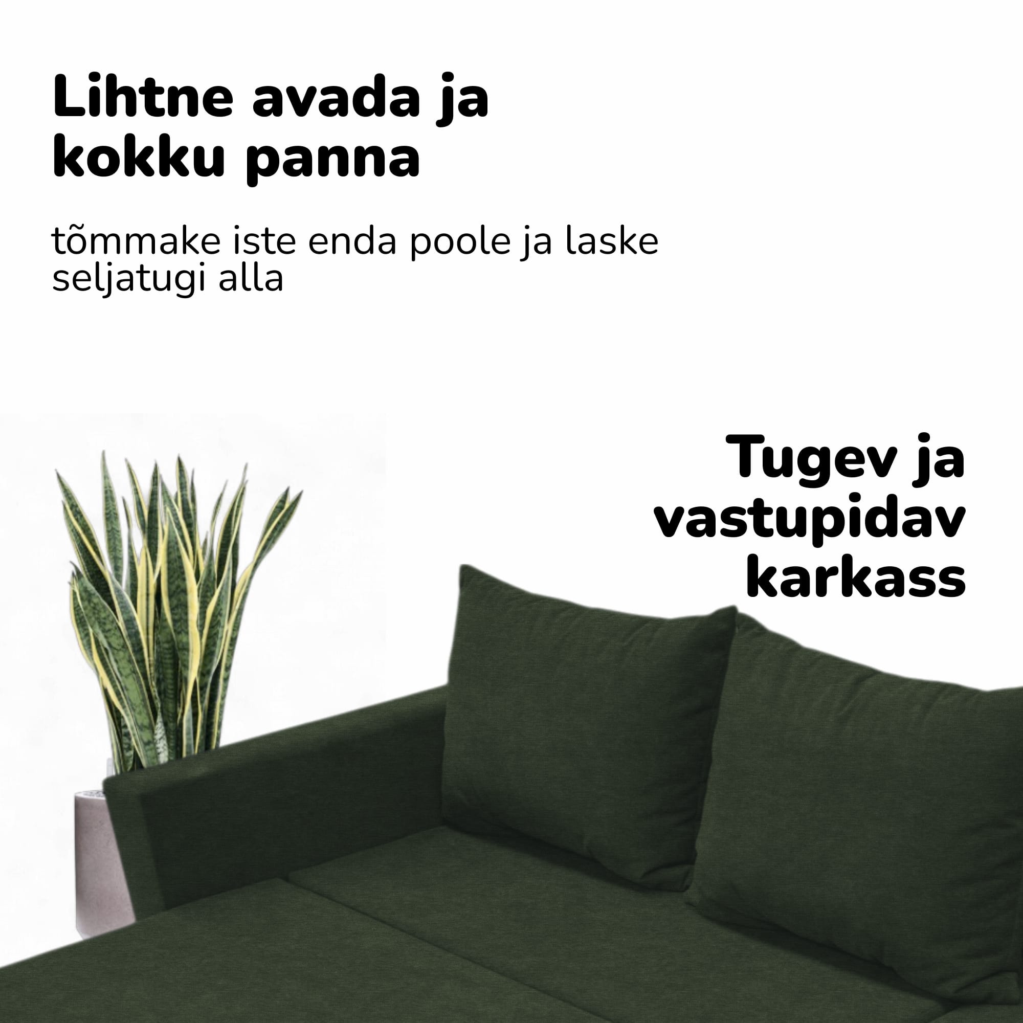 See mitmekülgne nurgadiivanvoodi on praktiline ja kompaktne lahendus igapäevaseks kasutamiseks igas toas. Tänu mitmekülgsele nurgale kohandub diivan kergesti nii vasakule kui ka paremale poole, pakkudes paindlikku paigutust. See muutub kiiresti mugavaks voodiks ja istme all asuv mahukas sahtel sobib ideaalselt voodipesu ja muude esemete hoidmiseks. Raam on valmistatud ülitugevast puitplaadist ja vineerist. Kõik ühendused on kruvitud, mis suurendab oluliselt konstruktsiooni tugevust ja pikendab diivani eluiga. Täiteaineks on kulumiskindel mööblikvaliteediga polüuretaanvaht, mis taastab kiiresti oma kuju ja tagab mugavuse nii istumisel kui ka magamisel. Polster on tihe veluur, keskkonnasõbralik ja hingav, meeldiv puudutusele. Kangas on kergesti puhastatav ja loodud raskeks kasutamiseks – see läbib Martindale’i testi 35 000 tsükliga. Mudel on saadaval populaarsetes värvides: beež, pruun, kollane, türkiissinine roheline, helehall ja grafiit. Sobib elutuppa, lastetuppa, kontorisse, kööki või magamistuppa ning näeb igas interjööris harmooniline välja. Ergonoomiline disain, kompaktne suurus, plekikindlus, magamisfunktsioon, lihtne hooldus ja kokkupanek, keskmine kõvadus ja mitmekülgsus teevad sellest diivanist suurepärase valiku. Kerged plekid on seebiveega kergesti eemaldatavad. Suurepärane hinna ja kvaliteedi suhe.