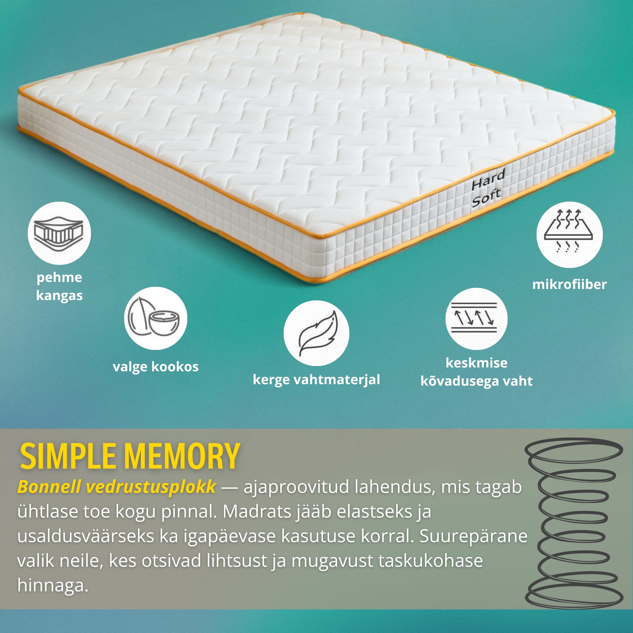 Simple Memory on kahepoolne algtaseme madrats, mis on loodud neile, kes otsivad mugavat und ilma üle maksmata. Sees on 13 kihti, sealhulgas Bonnell vedrusüsteem, mis on ajaproovile vastu pidanud ja tuntud oma töökindluse poolest. Üks külg on pehmem (4/10), teine ​​veidi kõvem (6/10) – saate valida endale sobiva mugavuse.